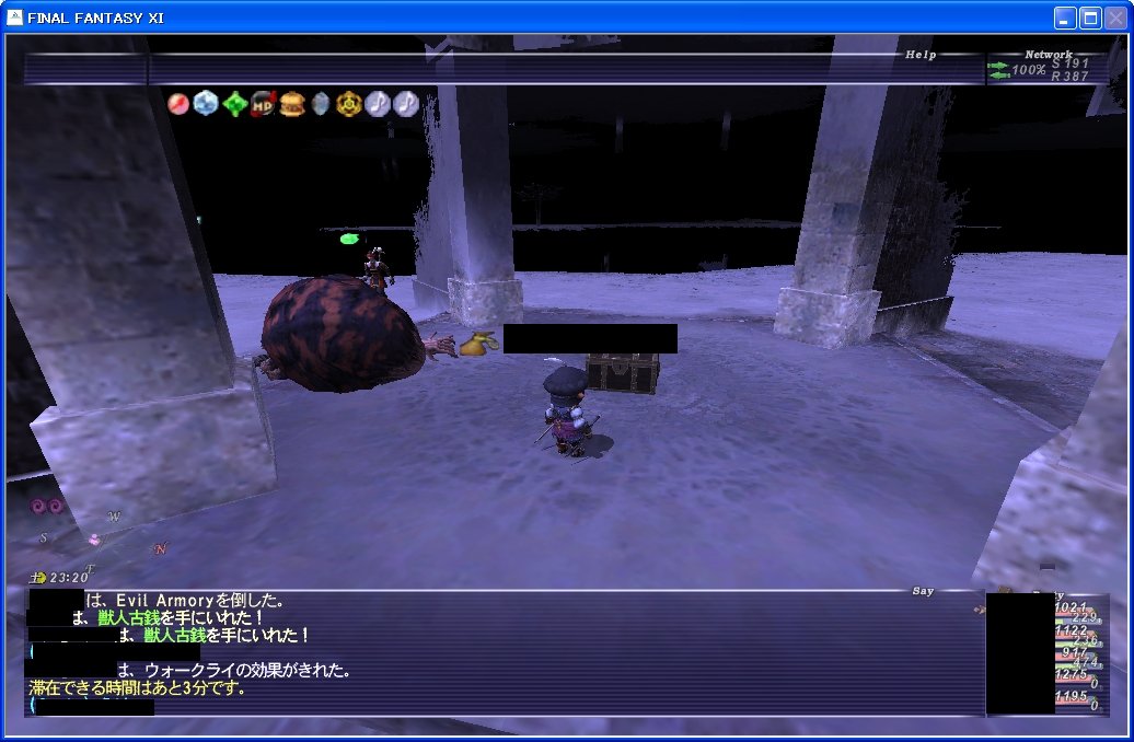 ソロ2回目:雑魚1やって、ボスやって、雑魚1やって時間切れ。黒素材と古銭3枚だったかな、戦利品。